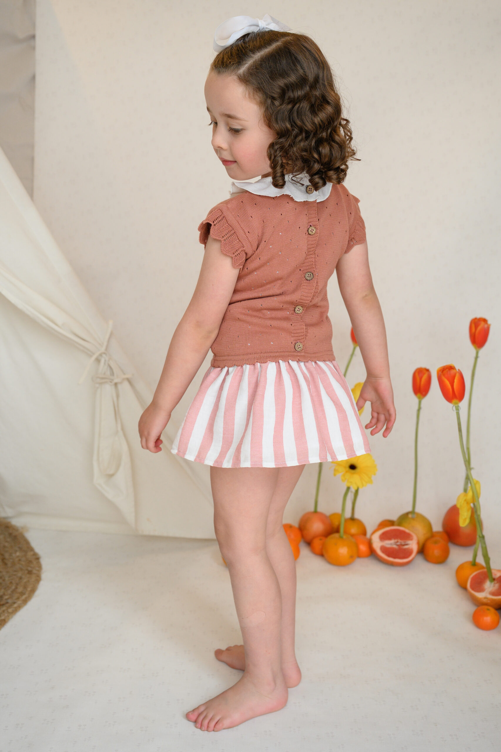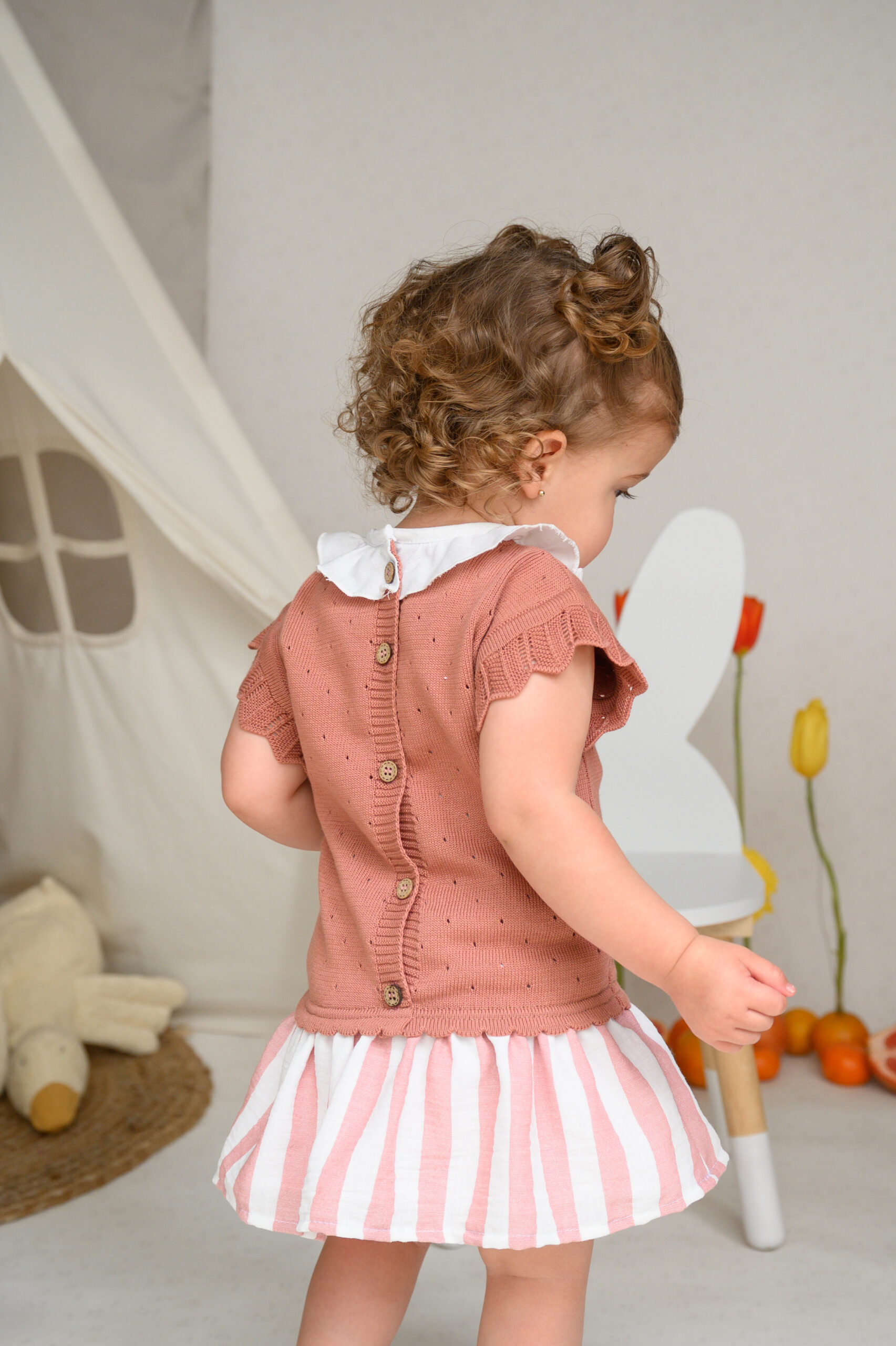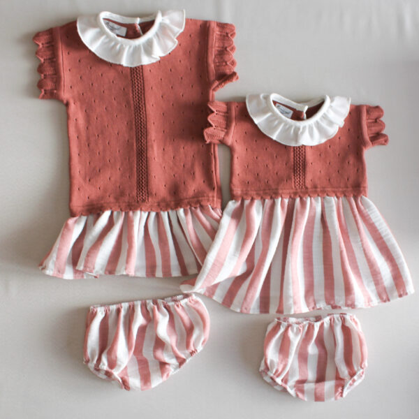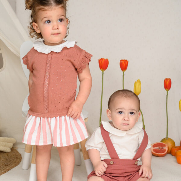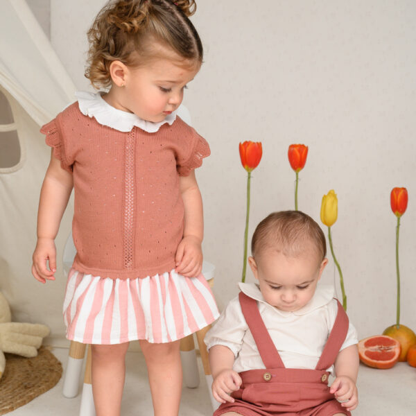 La falda y el calzón, hechos de una mezcla de algodón con lino, lo hacen fresco, ligero e ideal para cualquier ocasión especial. Además, ¡puedes hacer match con sus hermanos bebés y niños!