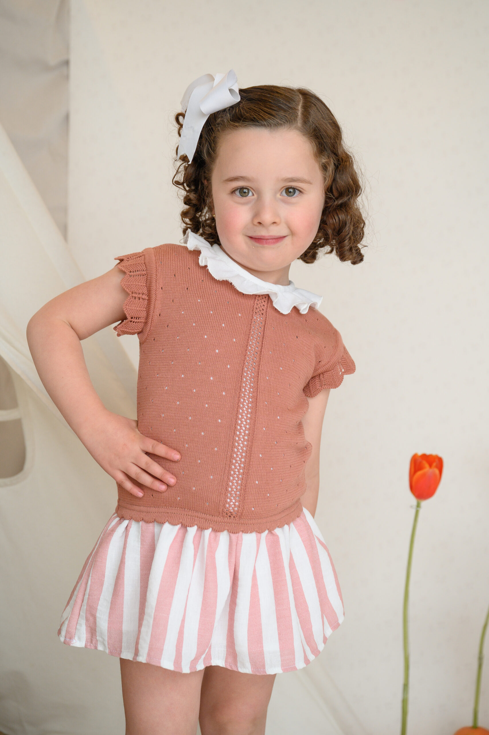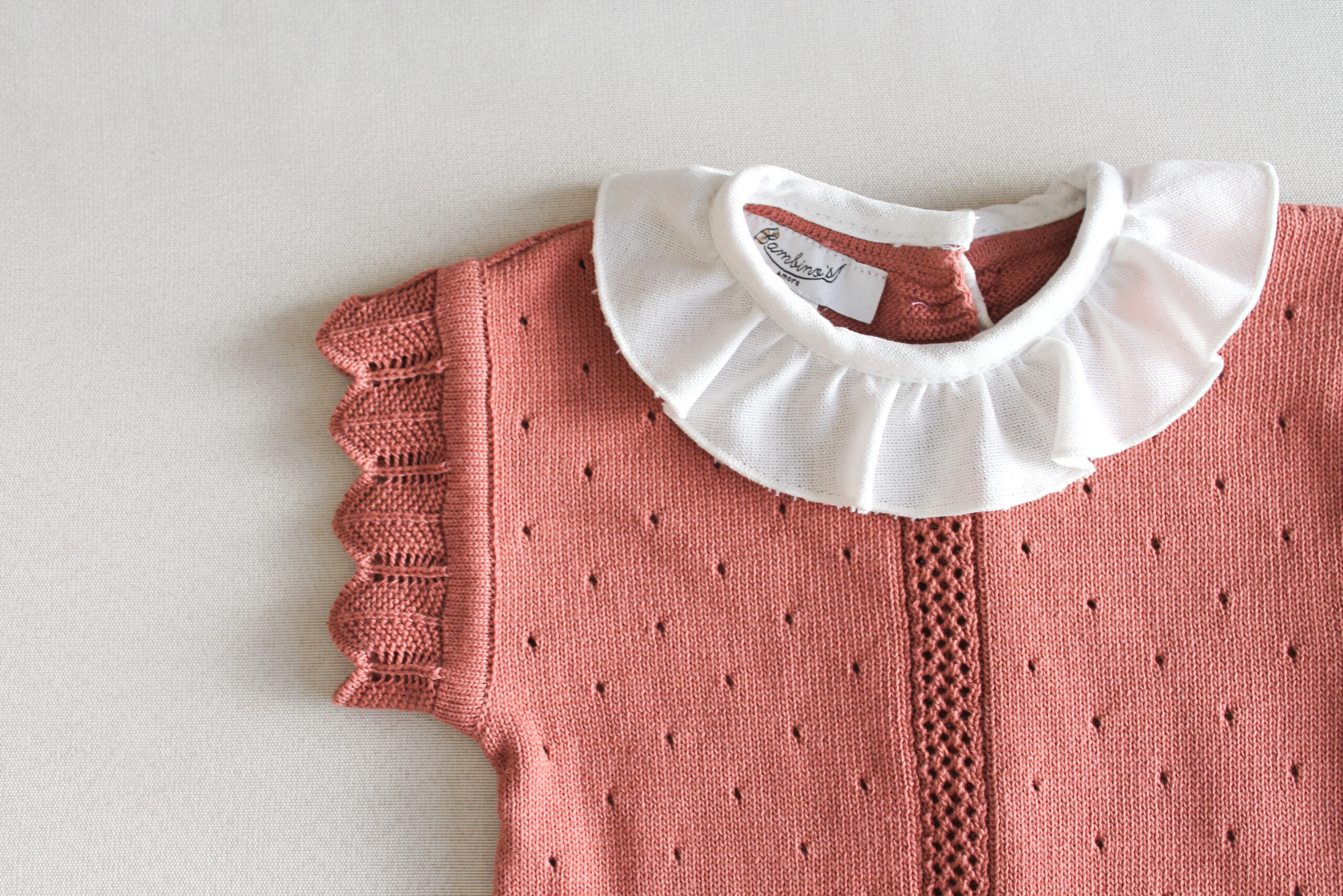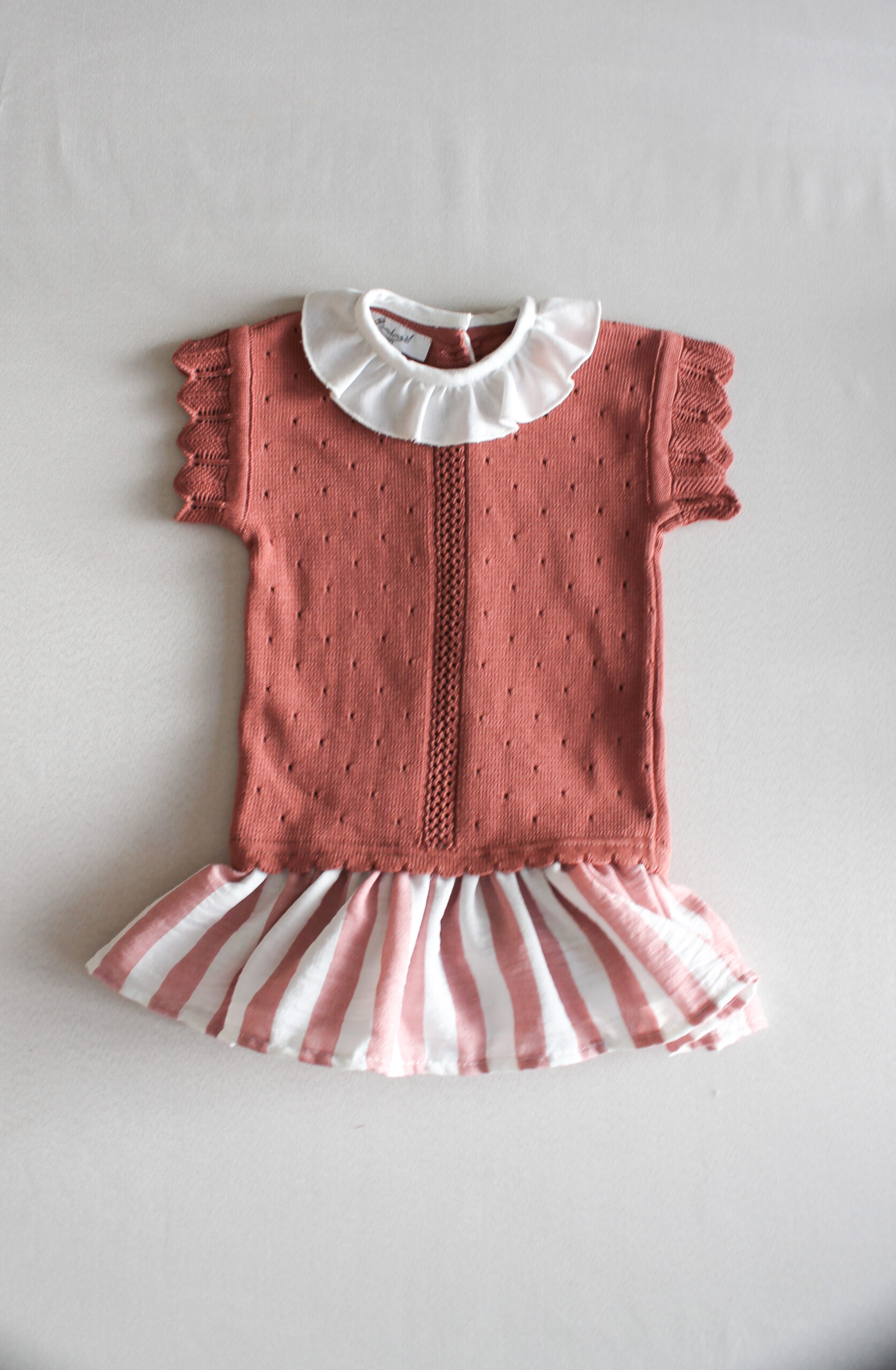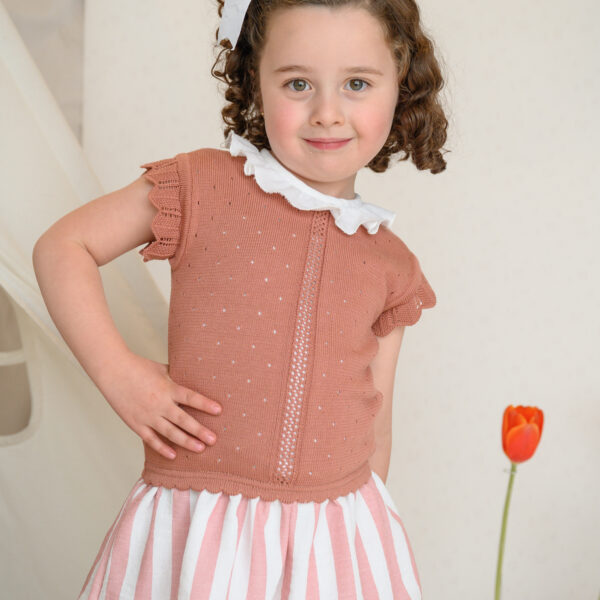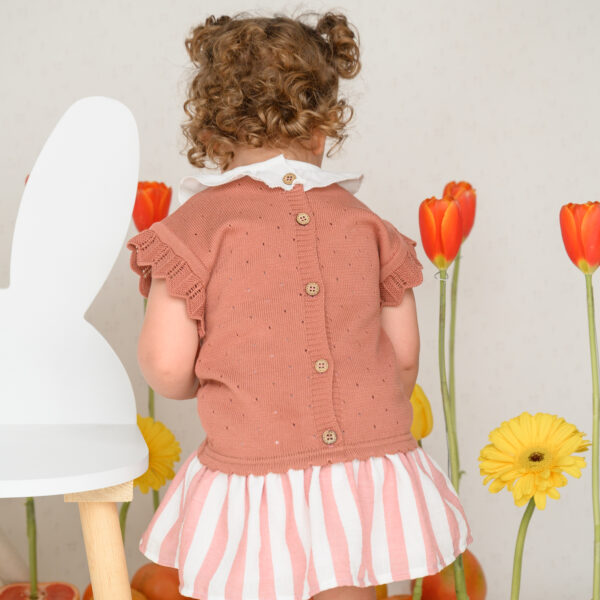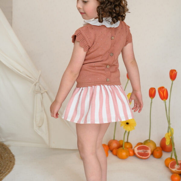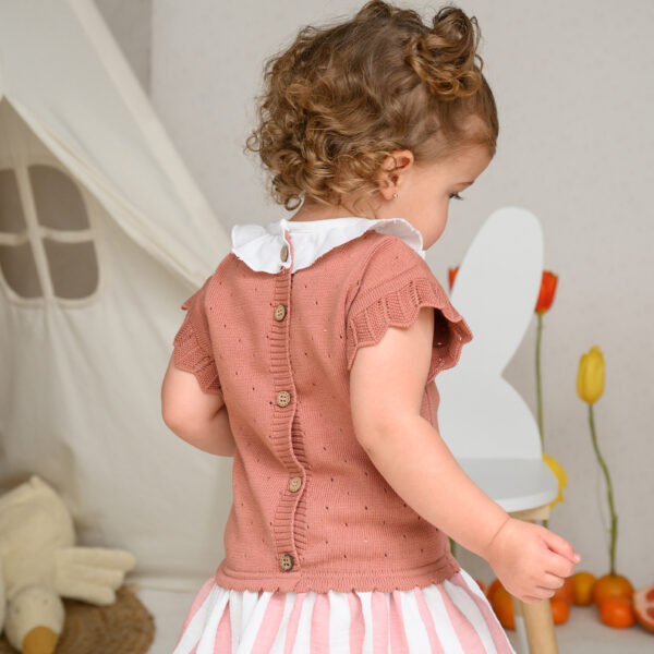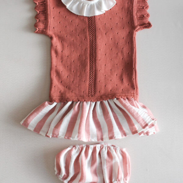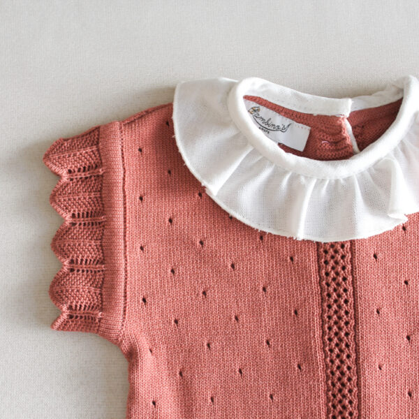 Con la parte superior tejida en color rosa mamey y cuello de olan, es un look elegante, cómodo y atemporal.